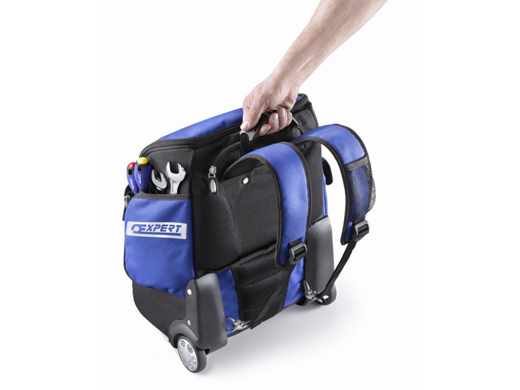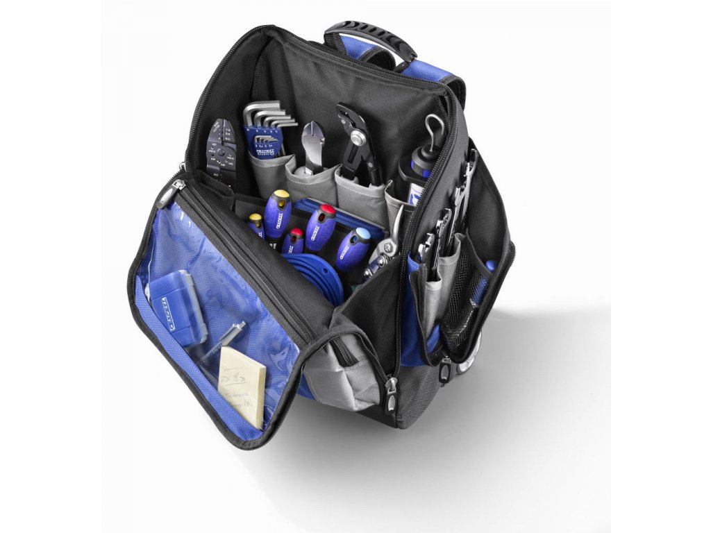 Pružné kapsy uvnitř i vně brašny, čelní úložný prostor.