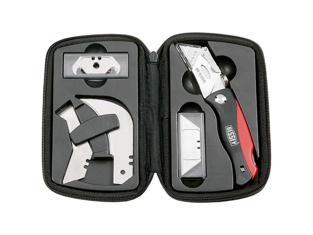 Provedení: Pouzdro z plastu, černočervené, s klipsem na opasek a zásobníkem na čepele v rukojeti. Rychlá a bezpečná výměna čepelí bez použití nástrojů. Na hřbetu čepele upevněný polštářek pro palec umožňuje přenos maximálního přítlaku. Čepel je pevná a může se spolu s přídržným systémem zaklapnout, jako u běžného zavíracího nože. Dodává se včetně 1 zavíracího nože s čepelí, 15 lichoběžníkových čepelí, 5 hákových čepelí a 2 čepelí na linoleum a 2 zapichovacích čepelí v nylonovém pouzdře.